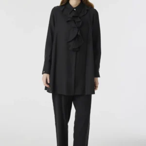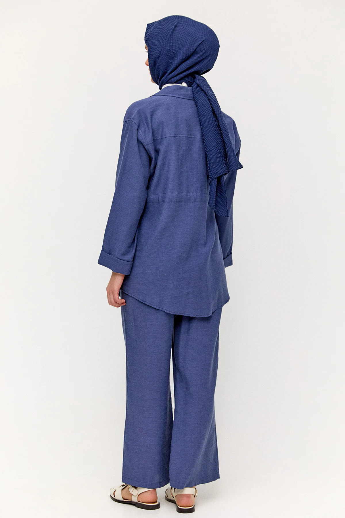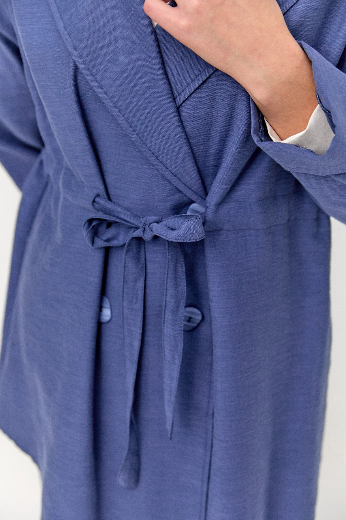 Ceket yakalı kruvaze kapamalı, düşük omuz ve duble manşet detaylarıyla sofistike bir duruş sunar. Oval etek ucu ve büzülebilir kuşak tasarımı şıklığı tamamlar. Beli lastikli, yüksek bel boru paça pantolonla birlikte modern, konforlu ve zamansız bir ikili takım deneyimi sağlar.